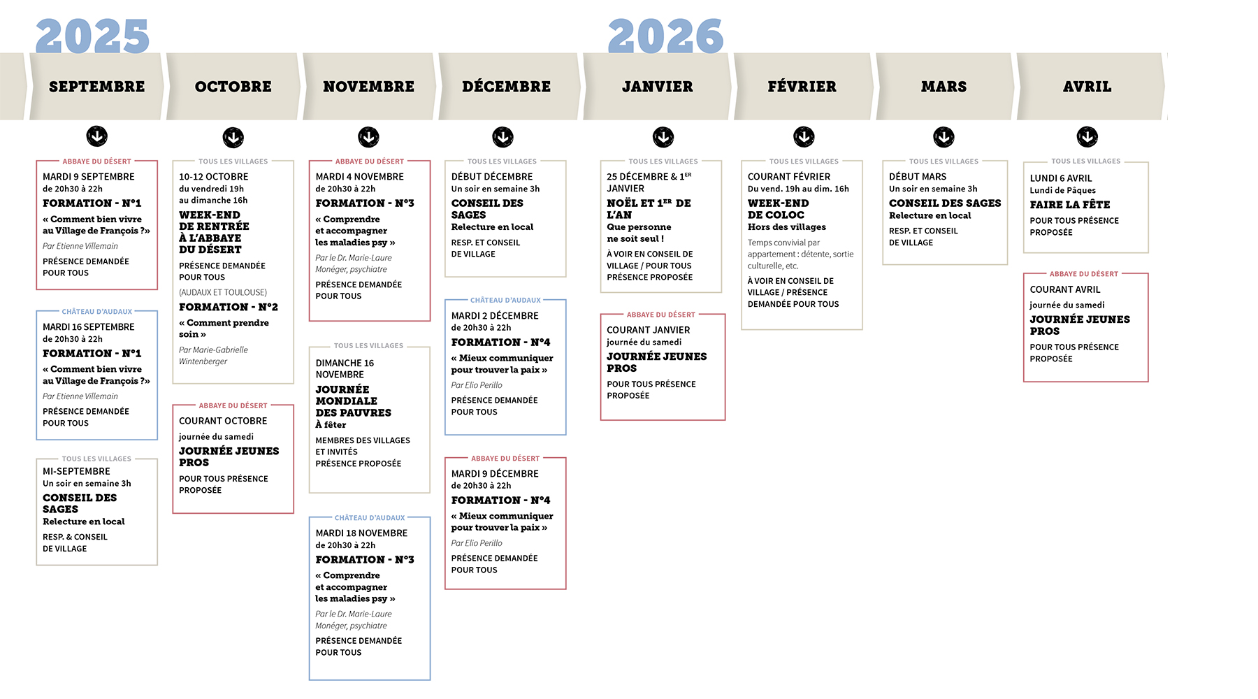 La vie au sein des Villages est rythmĂ©e par le programme de l’annĂ©e, avec des moments rĂ©guliers de vie collective :